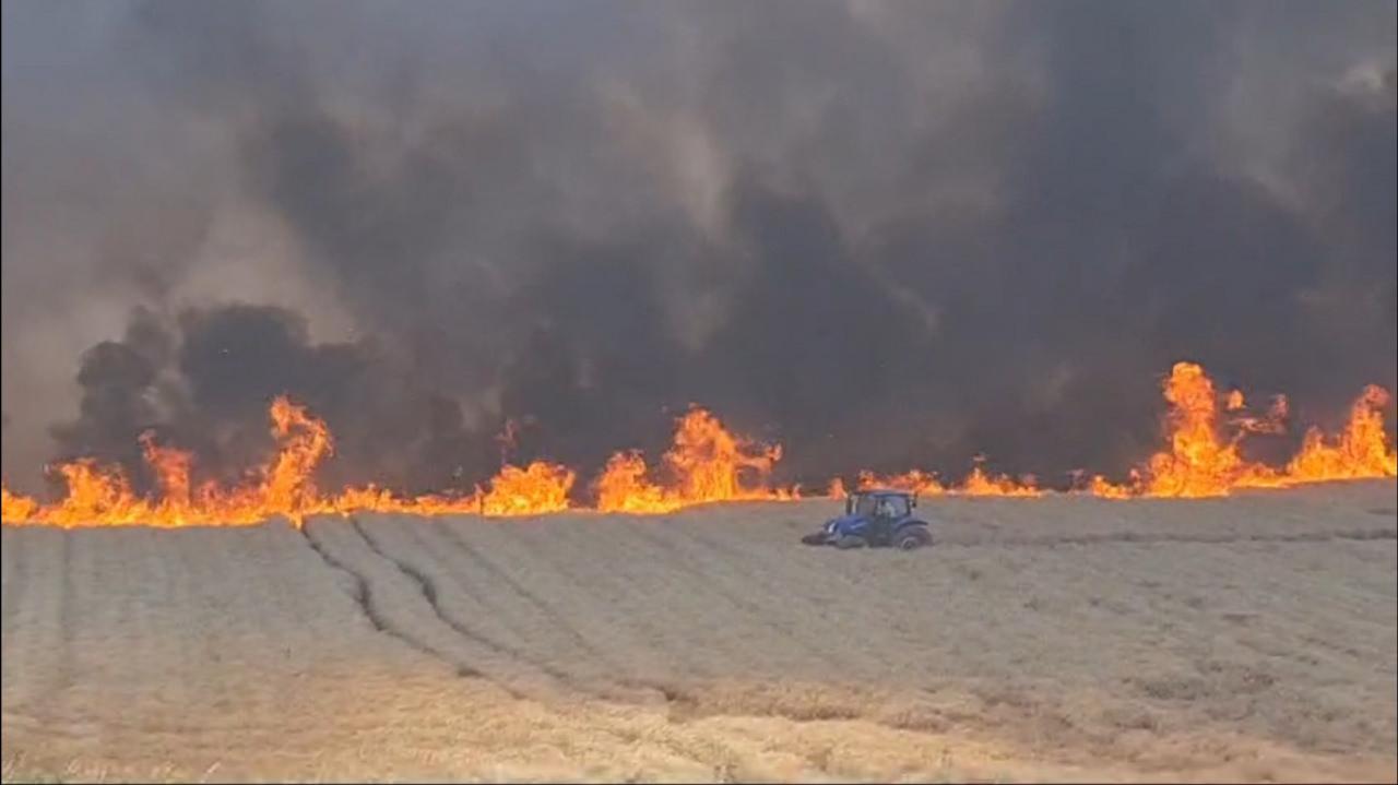 Diyarbakır'da çıkan yangında, 100 dönüm buğday ekili arazi yandı. Ekiplerin müdahale ettiği yangın, cep telefonu kamerasına yansıdı.