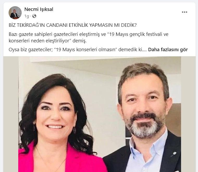 Süleymanpaşa'da 19 Mayıs Gençlik Festivali kapsamında 11 milyon liralık yapılan harcamaya Tekirdağ Gazeteciler Cemiyeti Başkanı Necmi Işıksal, "2 şarkıcıya para ödeyeceğiz, azıcık da onlar için kemerleri sıkın" şeklinde tepki gösterdi.