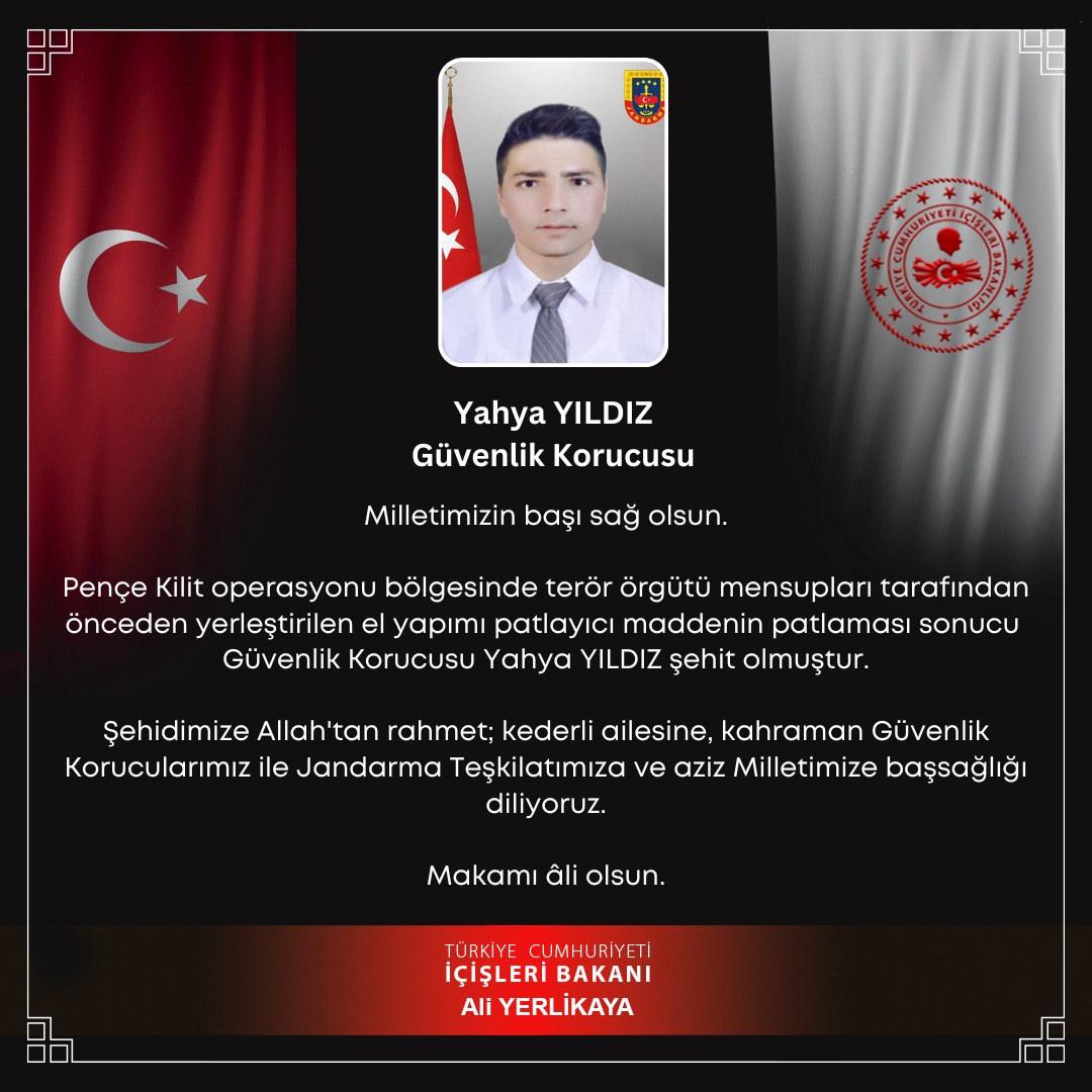 Bakanlığın sosyal medya hesabından yapılan açıklamada, “Pençe Kilit operasyonu bölgesinde terör örgütü mensupları tarafından önceden yerleştirilen el yapımı patlayıcı maddenin patlaması sonucu Güvenlik Korucusu Yahya Yıldız şehit olmuştur. Şehidimize Allah’tan rahmet; kederli ailesine, kahraman güvenlik korucularımız ile jandarma teşkilatımıza ve aziz milletimize başsağlığı diliyoruz” denildi.