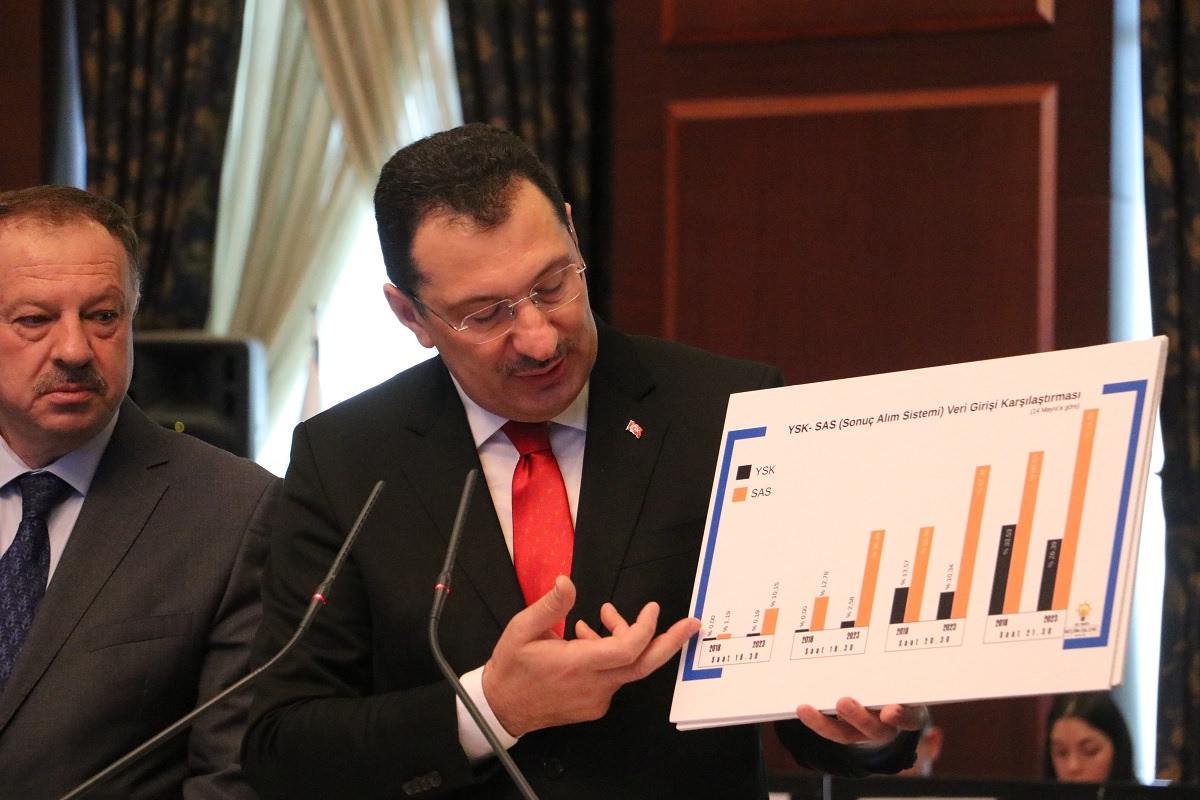 İlk sayımın büyükşehirlerde başladığını belirten Yavuz, “Daha sandık sonuçlarına bağlanmadan bizim arkadaşlarımız not alıyor ve Sonuç Alım Sistemi’ne giriyor. Onun için de biz Türkiye’de çok hızlı bir şekilde alıyoruz. 1 milyon aktif, 1 milyon da lojistiği sağlayan arkadaşlarımızla bu işi gerçekleştiriyoruz. Bu işi sağlimen yürütebilmenin yolu 2 milyon aktif teşkilat üyesinin yapmasıyla gerçekleşiyor. Bu işi yürütmek kolay değildir. Yürütmek için böyle bir teşkilat yapısına sahip olmak gerekir. Yine güçlü bir liderinin arkasında olması ve güçlü bir yazılımınızın olması lazım. Teşkilatçılıktan başka ne varsa yapmaya kalkıştıkları için, o geceyi gerçek bilgilerle aydınlatmak yerine ‘nasıl algı oluştururuz’ düşüncesiyle hareket ettikleri için CHP’den bugüne kadar olmadı, bugünden sonra da olmayacak. Kulağınız bizde olsun. Bizim dışarıya koyacağımız ekranlarla tabloları izlemeye devam edelim. Birtakım manipülasyonların önüne geçmek için duyarlı olalım. YSK da almış olduğu kararlarla bu işin şaibesiz ilerlemesini sağlıyor. Sonuçlar geldikçe de diğer partilerle paylaşıyor” ifadelerini kullandı.