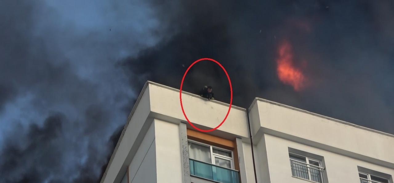Alev topuna dönen çatıda itfaiye erlerinden Halil Eskimiş, yangın hortumuna tutunarak aşağı inmeye çalışırken dengesini kaybedip yere çakıldı.