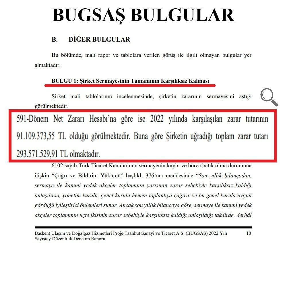 Öte yandan söz konusu şirket Sayıştay Raporları’nda da yer aldı. 2022 yılı Sayıştay Denetim Raporunda; sermayesinin tamamı karşılıksız bırakılarak şirket iflasın eşiğine getirildiği, Yönetim Kurulu’nun bu konu hakkında herhangi bir girişimde bulunmadığı, TTK’nın 376’ncı maddesi gereğince bu durumu ortadan kaldırmaya yönelik tedbirlerin alınmadığı tespit edildi.