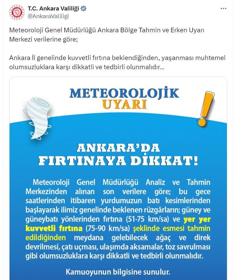 Ankara Valiliği, bugün gece saatlerinden itibaren kentte etkili olması beklenen fırtına nedeniyle ağaç devrilmesi ve çatı uçması gibi olaylara karşı uyarıda bulundu.