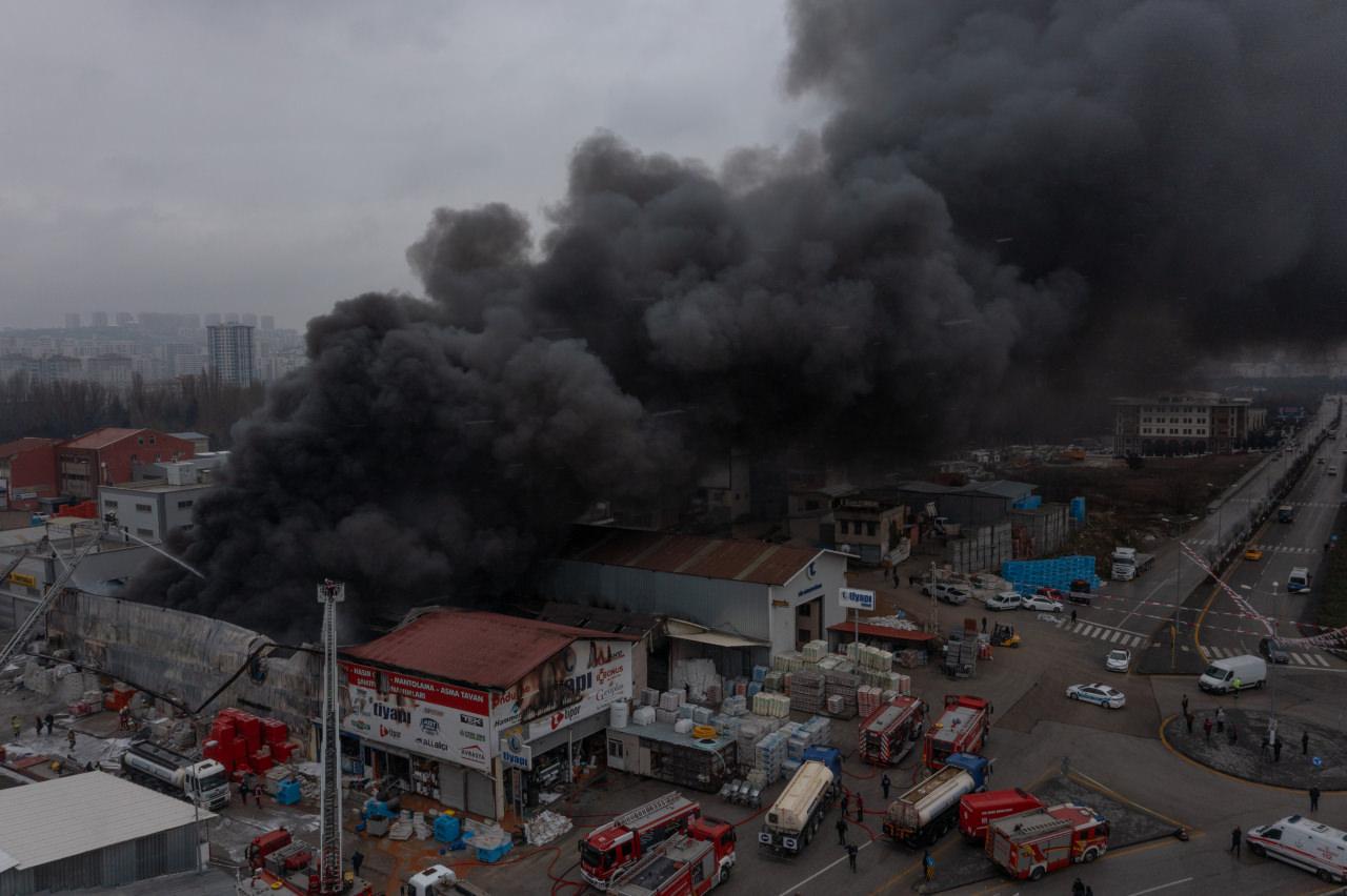 Yandaki iş yerlerine de sıçrayan yangını söndürmek için olay yerine sevk edilen çok sayıda itfaiye ekibinin müdahalesi sürüyor.
