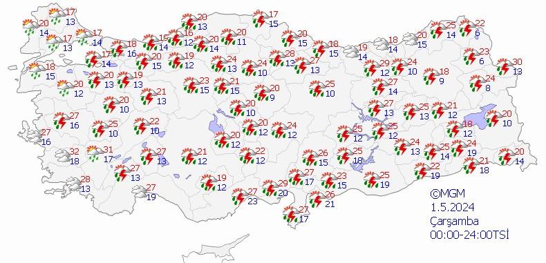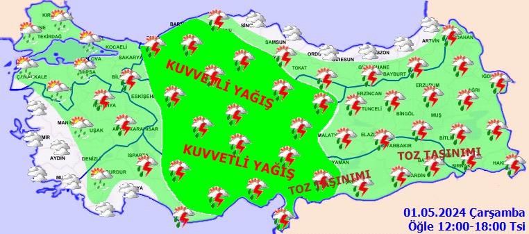 Meteoroloji Genel Müdürlüğü tarafından yapılan son değerlendirmelere göre, ülkemiz genelinin parçalı, yer yer çok bulutlu, Marmara, İç Ege, Batı Akdeniz’in iç kesimleri, Doğu Akdeniz, İç Anadolu, Karadeniz ile Doğu ve Güneydoğu Anadolu’nun yerel olmak üzere sağanak ve gök gürültülü sağanak yağışlı geçeceği tahmin ediliyor. Yağışların, Doğu Akdeniz, İç Anadolu (Eskişehir hariç), Batı Karadeniz (Sinop hariç) ile Çorum, Amasya, Gaziantep ve Kilis çevrelerinde yer yer kuvvetli olması bekleniyor. Doğu Akdeniz, İç Anadolu’nun güneyi, Doğu ve Güneydoğu Anadolu’da toz taşınımı beklenmektedir.