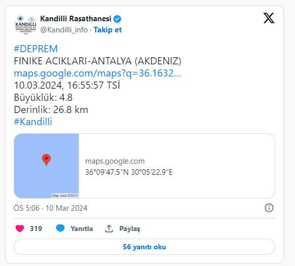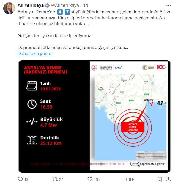 X hesabından paylaşım yapan İçişleri Bakanı Ali Yerlikaya, “Antalya, Demre’de 4,7 büyüklüğünde meydana gelen depremde AFAD ve ilgili kurumlarımızın tüm ekipleri derhal saha taramalarına başlamıştır. An itibari ile olumsuz bir durum yoktur.” ifadelerini kullandı.