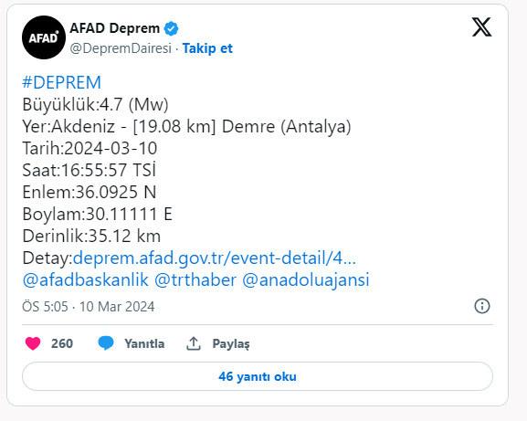 AFAD’ın sosyal medya hesabından yapılan açıklamada “Akdeniz’de, Antalya ilimizin Demre ilçesi açıklarında saat 16.55’te meydana gelen 4.7 büyüklüğündeki deprem sonrası, an itibarıyla, olumsuz bir durum bulunmamaktadır. Saha tarama çalışmaları devam etmektedir. Etkilenen vatandaşlarımıza geçmiş olsun dileklerimizi sunarız” denildi.