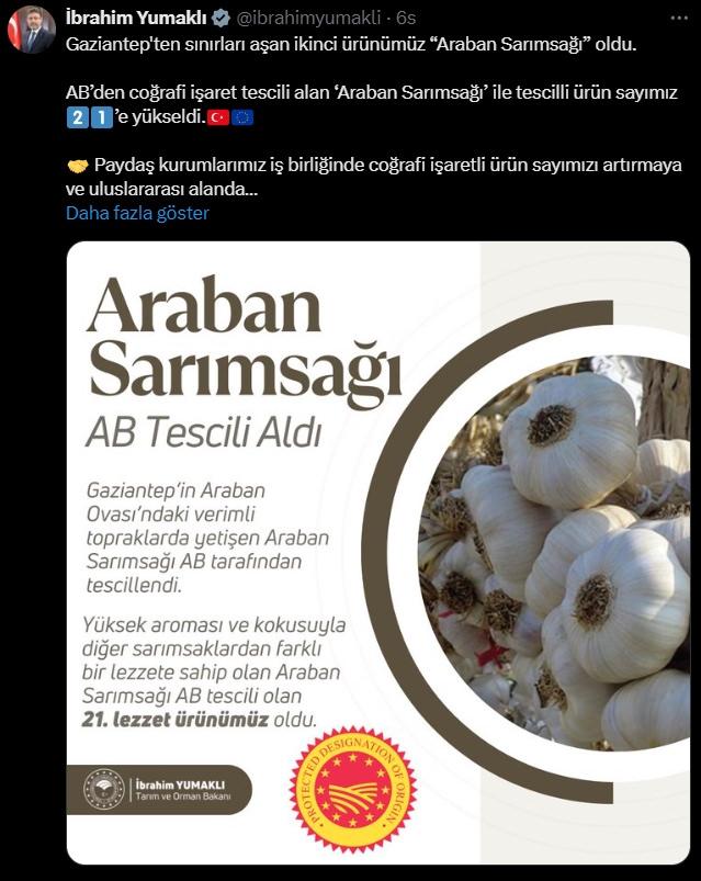 “AB’den coğrafi işaret tescili alan Araban sarımsağı ile tescilli ürün sayımız 21’e yükseldi. Araban Ovası’ndaki verimli topraklarda yetişen Araban sarımsağı, yüksek aroması ve kokusuyla diğer sarımsaklardan farklı bir lezzete sahip. Paydaş kurumlarımız işbirliğinde coğrafi işaretli ürün sayımızı artırmaya ve uluslararası alanda tanıtmaya devam edeceğiz.”
