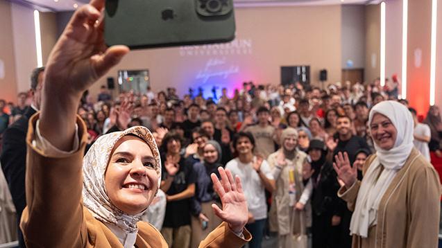 Bakan Göktaş, konuşmasının sonunda İHÜ Rektörü Prof. Dr. Atilla Arkan ve TÜRGEV Yönetim Kurulu Başkanı Hatice Akıncı Yılmaz’la birlikte öğrencilerle öz çekim yaptı.