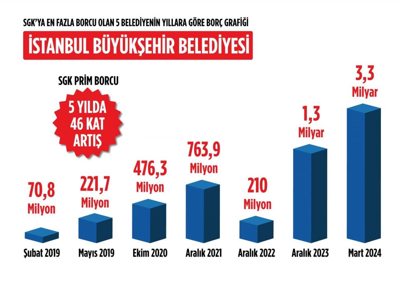 Bakan Işıkhan’ın canlı yayında SGK’ya en fazla borcu olan 5 belediyenin yıllara göre borç grafiğini de paylaştı. Tabloda CHP’li İBB’nin SGK prim borçlarının 5 yılda 46 kat artış gösterdiği görüldü.