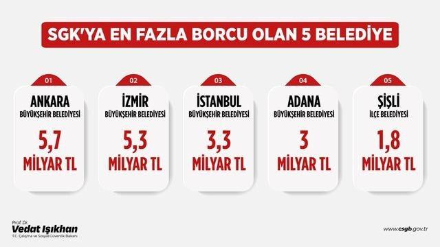 Çalışma ve Sosyal Güvenlik Bakanı Vedat Işıkhan, geçtiğimiz günlerde yaptığı açıklamada, “Türkiye genelinde belediyelerin SGK’ya olan toplam prim borcu 96 Milyar TL’ye ulaşmış durumda. Bu borçların %67,7’si tek başına CHP’li belediyelere ait.” ifadelerini kullanmıştı.