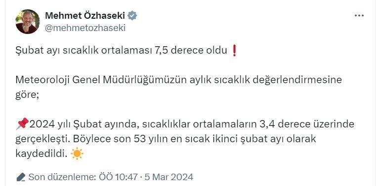 Bakan Mehmet Özhaseki, sosyal medya hesabından yaptığı açıklamada, “Şubat ayı sıcaklık ortalaması 7,5 derece oldu. Meteoroloji Genel Müdürlüğümüzün aylık sıcaklık değerlendirmesine göre; 2024 yılı Şubat ayında, sıcaklıklar ortalamaların 3,4 derece üzerinde gerçekleşti. Böylece son 53 yılın en sıcak ikinci şubat ayı olarak kaydedildi” dedi.