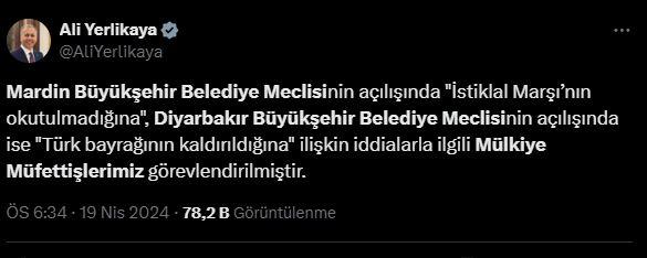 Bakan Yerlikaya resmi X hesabından yaptığı paylaşımda, Mardin Büyükşehir Belediye Meclisinin açılışında “İstiklal Marşı’nın okutulmadığına”, Diyarbakır Büyükşehir Belediye Meclisinin açılışında ise “Türk bayrağının kaldırıldığına” ilişkin iddialarla ilgili Mülkiye Müfettişlerimiz görevlendirilmiştir.” dedi.