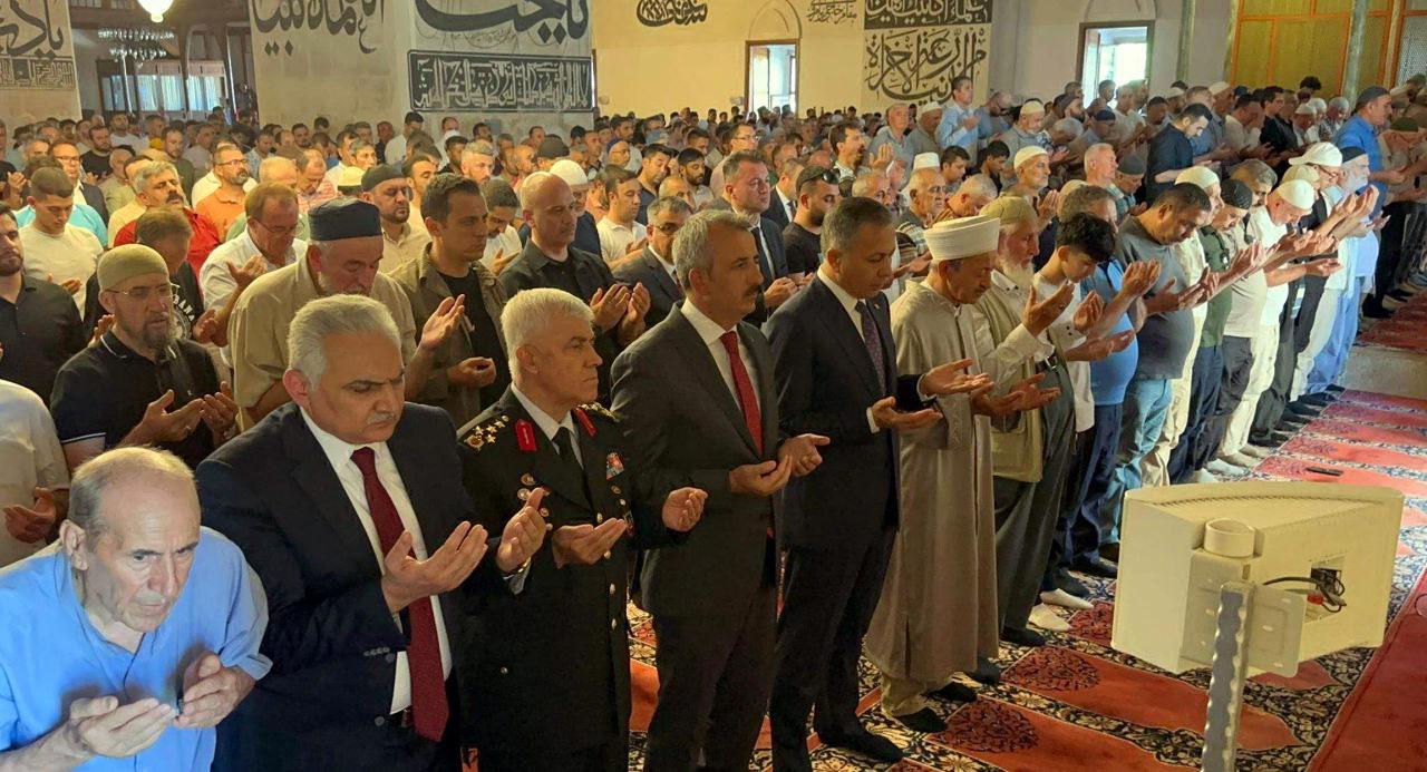 İçişleri Bakanı Ali Yerlikaya, kentteki kolluk kuvvetleri temsilcileriyle düzenlenen huzur toplantısına katılmak ve ziyaretlerde bulunmak üzere Edirne’ye geldi. Kentin tarihi camilerinden Eski Cami’de cuma namazı kılan Yerlikaya, ardından Hamas’ın Siyasi Büro Şefi İsmail Haniye için cemaatle birlikte gıyabi cenaze namazı kıldı. Cenaze namazını Edirne İl Müftüsü Hasan Başoğlu kıldırdı.