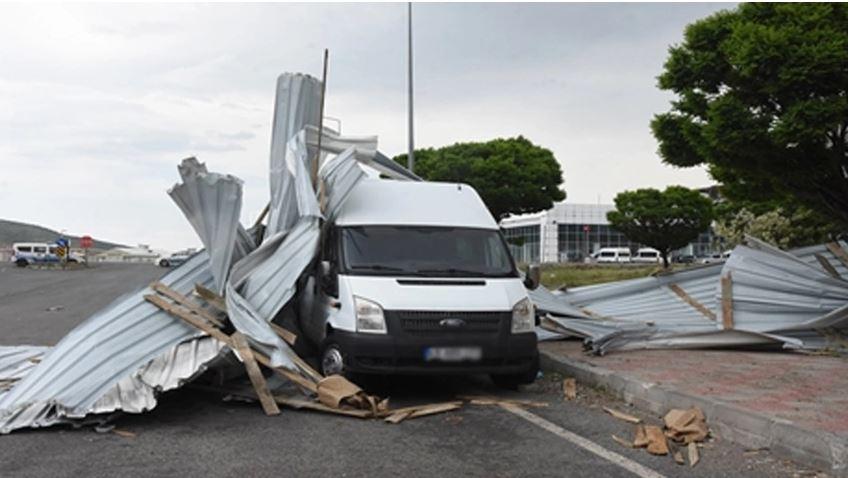 Çatılardan kopan sac ve tahta parçalarının isabet ettiği iki binanın dış cephesinde, cam balkonlar ve balkon korkulukları ile park halindeki 2 minibüste hasar meydana geldi.