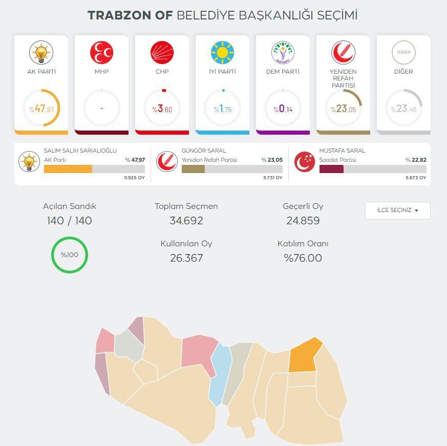 Trabzon’da 150 yıldır aynı ailenin yönettiği Of ilçesinde gelenek bozulmadı. 31 Mart Mahalli İdareler Genel Seçimleri’nde oyların çoğunluğunu olan Salim Salih Sarialioğlu ilçede güven tazeledi.