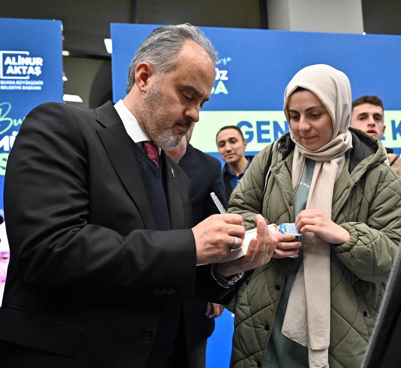 Soru cevap bölümünde gençler Bursa’ya dair hayal ve beklentilerini dile getirirken, Başkan Aktaş ve salonu dolduranlar hep bir ağızdan ‘Beraber yürüdük biz bu yollarda’ şarkısını seslendirdi. Programında sonunda Bahadır Yenişehirlioğlu, Başkan Alinur Aktaş tarafından gençlere hediye edilen ‘Derviş’ isim kitabını imzaladı.