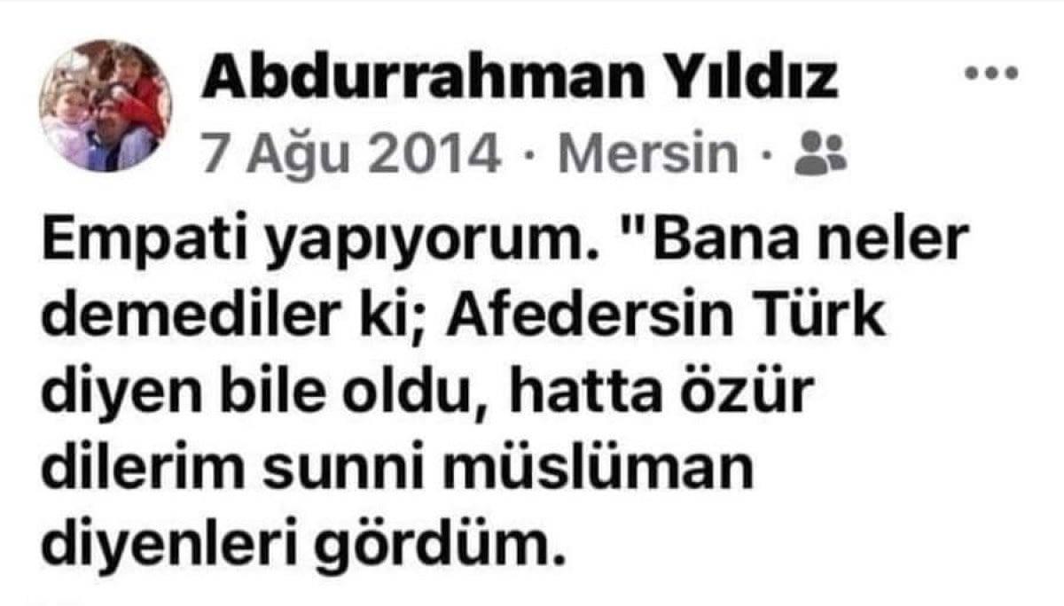 Yıldız’ın, kendisine Türk denildiği için üzüntü duyduğu paylaşımı dikkat çekti. Yıldız paylaşımında, “Empati yapıyorum. Bana neler demediler ki; Afedersin Türk diyen bile oldu. Hatta özür dilerim Sünni Müslüman diyenleri gördüm.” ifadelerini kullanıyor.