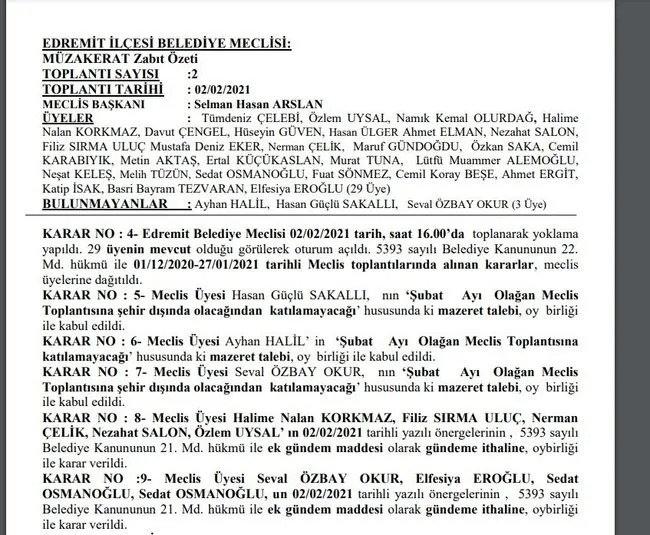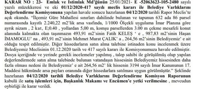 Kaz Dağları’nın hemen yakınında bulunan arsanın 493,91 m2’nin Fatih Keleş, 987,83 m2’nin Hasan İmamoğlu, 493,91 m2’nin Mehmet Murat Çalık tarafından satın alındığı bildirildi. Fatih Keleş, Hasan İmamoğlu ve Mehmet Murat Çalık’ın; Edremit Belediyesi’nin sahibi olduğu 264,56 m2’lik arsayı da satın aldığı bildirildi. Edremit Belediyesi’nin 2 Şubat 2021 tarihli kararıyla 264,56 m2’lik arsa söz konusu kişilere satıldı.