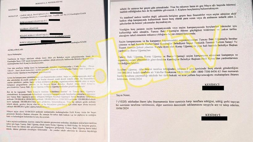 CHP’nin İzmir Karabağlar Belediye başkanı Helil Kınay’a seçim döneminde borç veren kişiler alacağını tahsil edemediği için ihtar gönderdi. İhtara cevap veren başkan Kınay seçim kampanyası sürecinde kimseden borç almadığını, maddi destek talebinde bulunmadığını ve bağış kampanyası yapmadığını ifade ederek “alınan ya da toplanan paralardan haberi olmadığını söyledi”