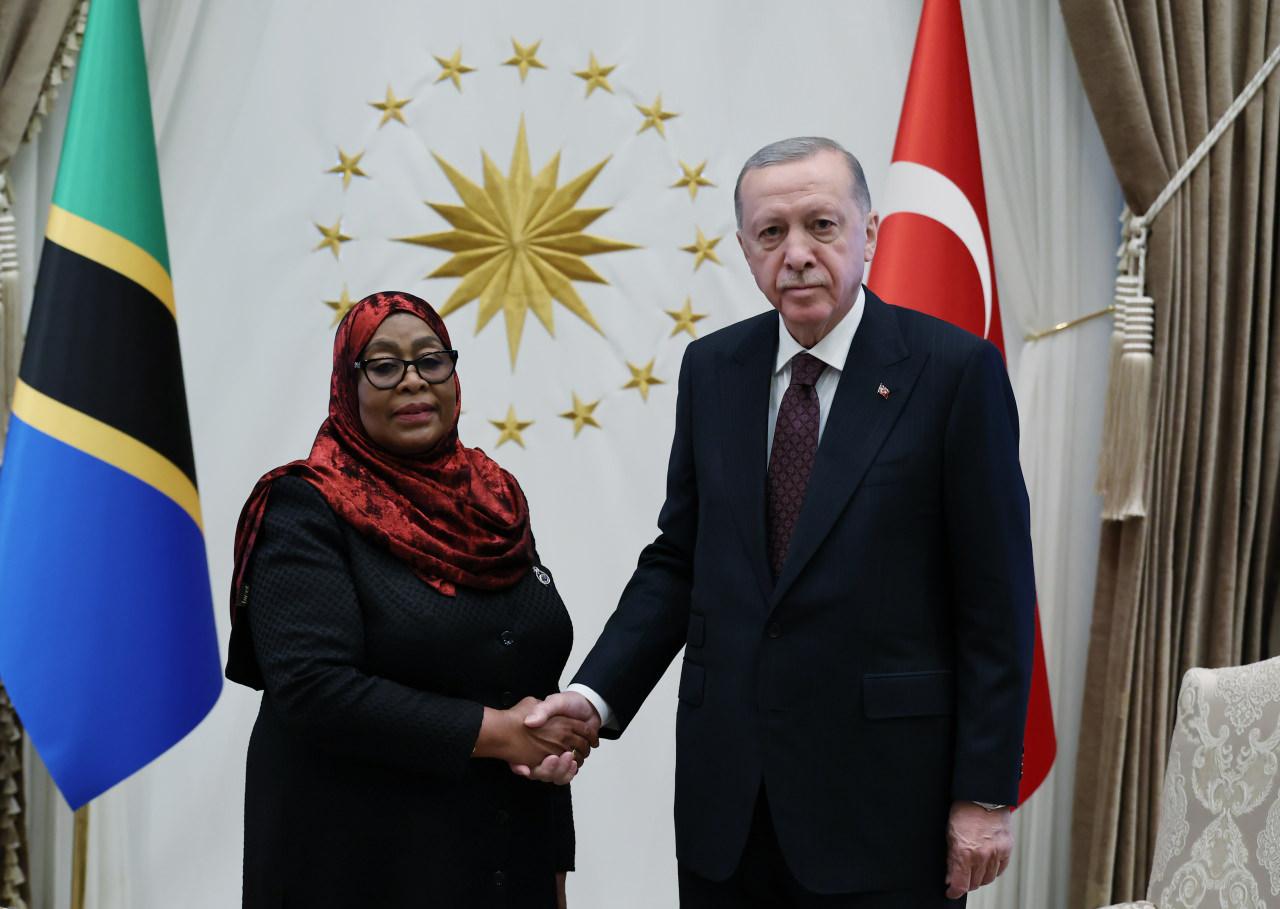 Erdoğan ve Hassan, merdivenlerde Türkiye ve Tanzanya bayrakları önünde tokalaşarak gazetecilere poz verdi.