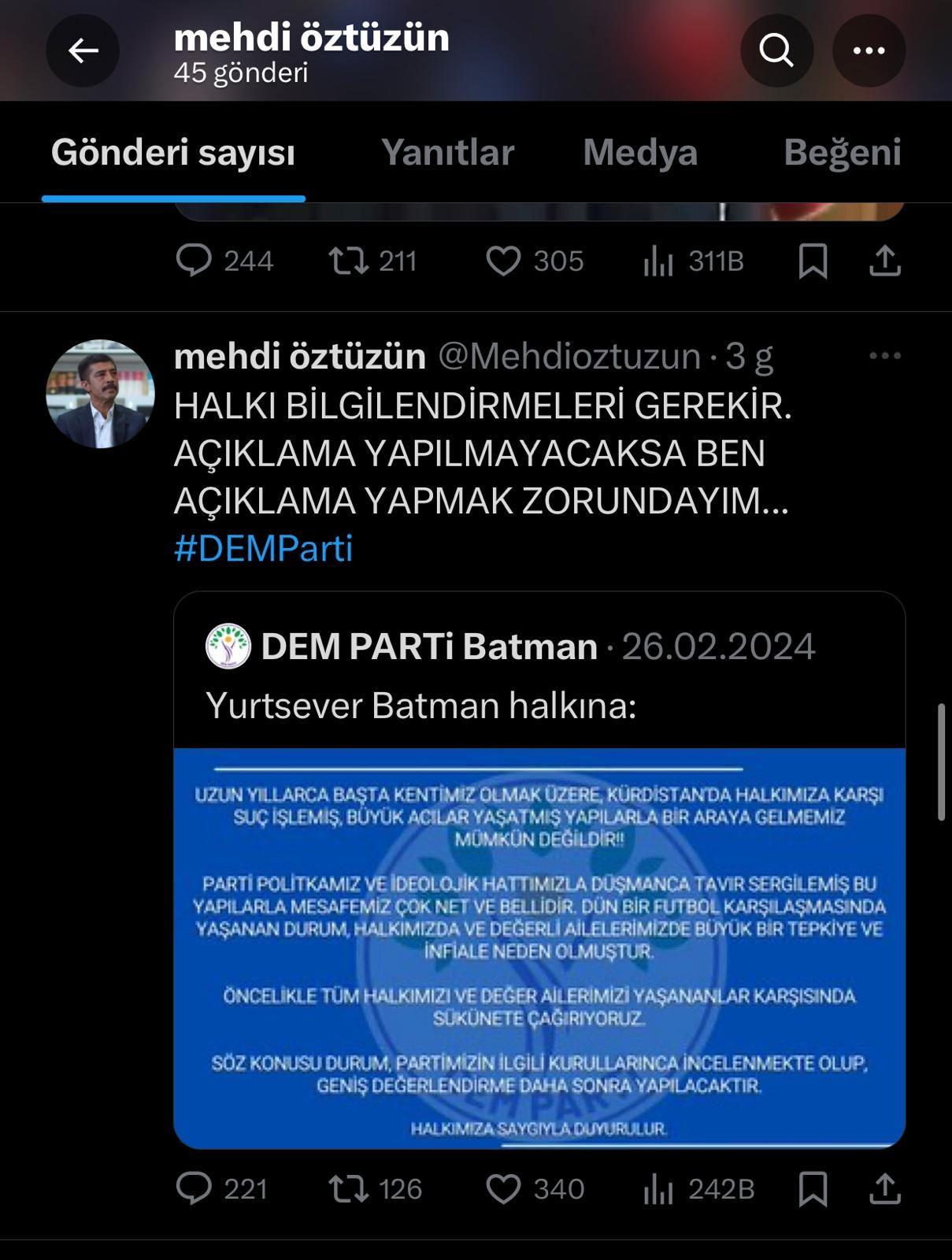 Batman’da 25 Şubat’ta Batman Petrolspor ile Anadolu Üniversitesi arasında oynanan futbol müsabakasında maçı taraftarlar arasında HÜDA PAR Batman Belediye Başkan Adayı Serkan Ramanlı ile birlikte izlediği sırada yan yana fotoğrafı çıkan DEM Adayı Mehdi Öztüzün ile ilgili parti içerisinde çıkan rahatsızlığın ardından partiden ilginç bir adım geldi.
