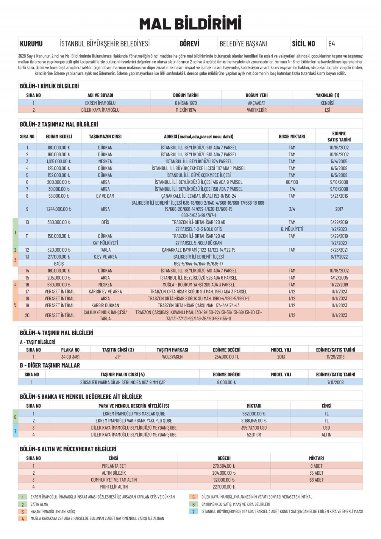 Emirgan'da 50 milyon dolar lira değerindeki villalarını mal varlığında açıklamadığı ortaya çıkan Ekrem İmamoğlu, 2019 yılında açıkladığı babasının mal varlığını 2024 seçimlerine giderken açıklamadı.