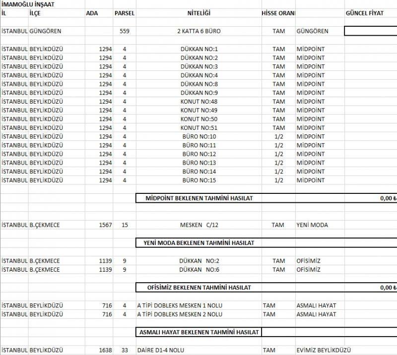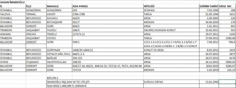25 Haziran 2019 tarihi itibarıyla İmamoğlu İnşaat Ticaret ve Sanayi Limited Şirketi üzerine kayıtlı bulunan gayrimenkuller şu şekilde sıralandı: