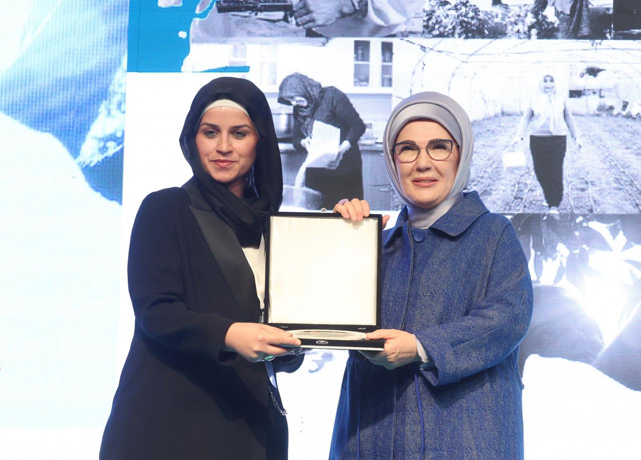 Emine Erdoğan, “Tarlada, hasatta, nakliyede ve depolamada gıda kaybını önleyecek kalıcı çözümler üreteceğiniz kanaatindeyim. Bu noktada, aile çiftçiliği de hem iklim değişikliğiyle mücadelede hem de sürdürülebilir tarımda önemli bir güçtür.” şeklinde konuştu.