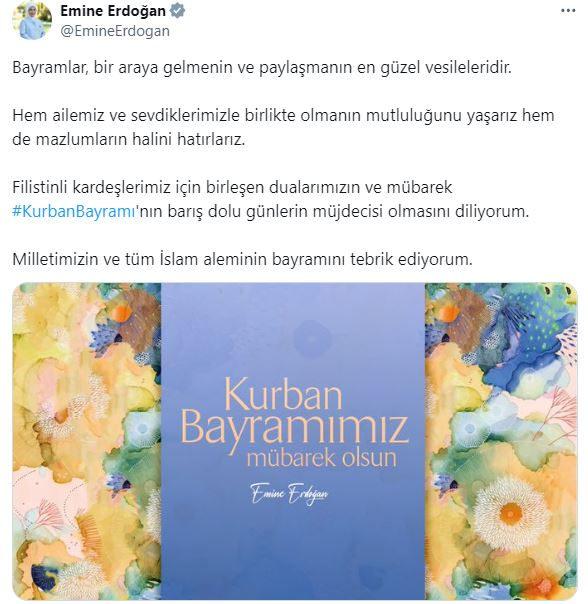 Emine Erdoğan, Kurban Bayramı dolayısıyla sosyal medya hesabından paylaştığı mesajda, “Bayramlar, bir araya gelmenin ve paylaşmanın en güzel vesileleridir. Hem ailemiz ve sevdiklerimizle birlikte olmanın mutluluğunu yaşarız hem de mazlumların halini hatırlarız. Filistinli kardeşlerimiz için birleşen dualarımızın ve mübarek Kurban Bayramı’nın, barış dolu günlerin müjdecisi olmasını diliyorum. Milletimizin ve tüm İslam aleminin bayramını tebrik ediyorum” dedi.