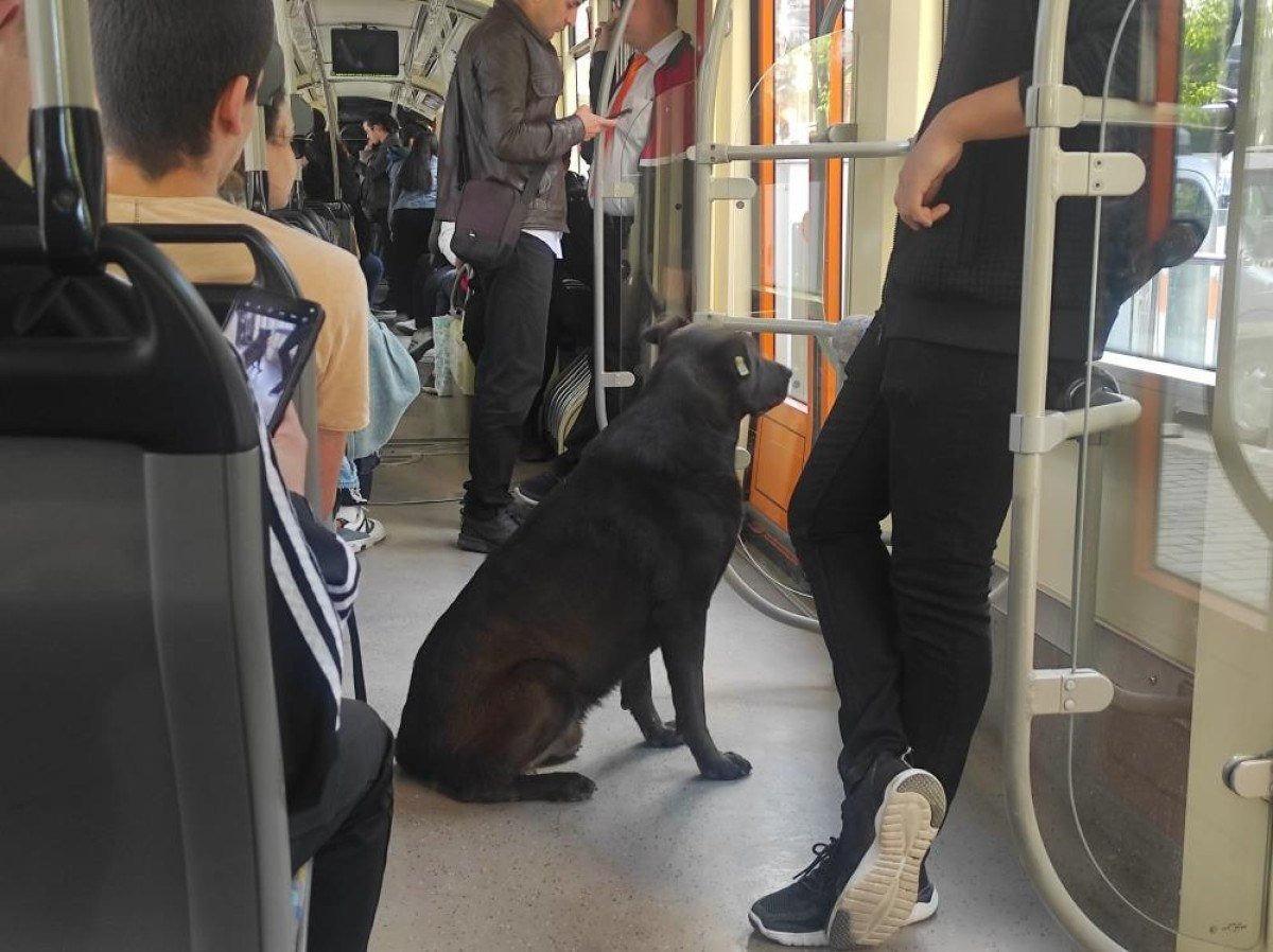 Tramvay şehir merkezine yaklaştıkça kalabalıklaşırken, köpek yoğunluğa rağmen olduğu yerde durmaya devam etti.