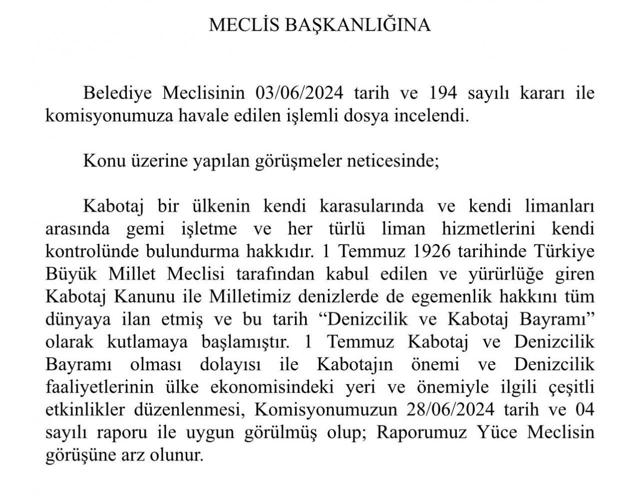 Etimesgut Belediyesi Kabotaj Bayramı kabul cevabında şu ifadeleri kullanmıştı;Kabotaj bir ülkenin kendi karasularında ve kendi limanları arasında gemi işletme ve her türlü liman hizmetlerini kendi kontrolünde bulundurma hakkıdır. 1 Temmuz 1926 tarihinde Türkiye Büyük Millet Meclisi tarafından kabul edilen ve yürürlüğe giren Kabotaj Kanunu ile Milletimiz denizlerde de egemenlik hakkını tüm dünyaya ilan etmiş ve bu tarih “Denizcilik ve Kabotaj Bayramı” olarak kutlamaya başlamıştır. 1 Temmuz Kabotaj ve Denizcilik Bayramı olması dolayısı ile Kabotajın önemi ve Denizcilik faaliyetlerinin ülke ekonomisindeki yeri ve önemiyle ilgili çeşitli etkinlikler düzenlenmesi, Komisyonumuzun 28/06/2024 tarih ve 04 sayılı raporu ile uygun görülmüş olup; Raporumuz Yüce Meclisin görüşüne arz olunur