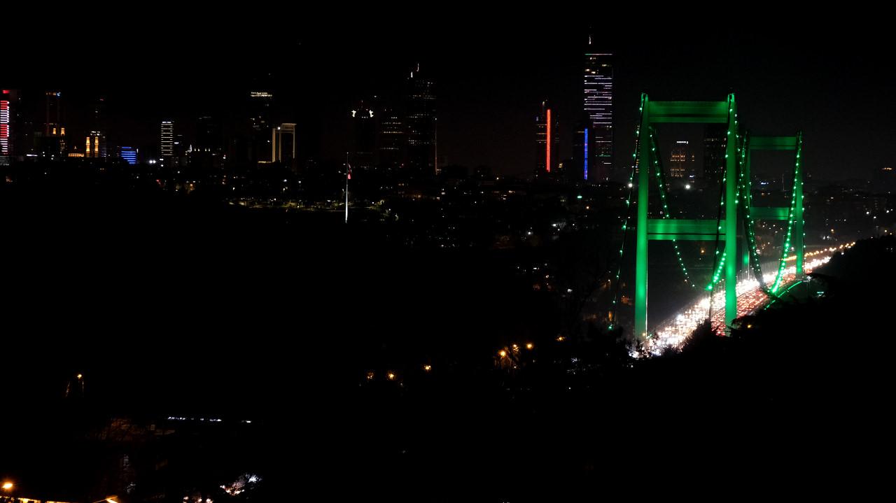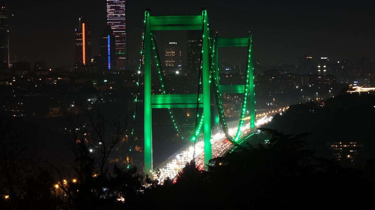 İstanbul'un simge noktalarından Fatih Sultan Mehmet (FSM) Köprüsü, İrlanda Milli Günü dolayısıyla yeşil renkte aydınlatıldı.