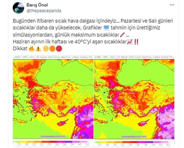 Türkiye'nin bugün itibarıyla sıcak hava dalgası içinde olduğunu vurgulayan Prof. Dr. Barış Önol, "Sıcak günler bitti, çok daha sıcak günler kapıda. Kıpkırmızı gezegen" ifadelerini kullandı.