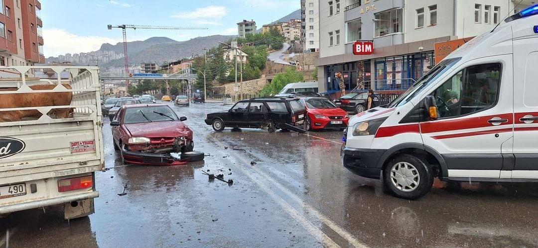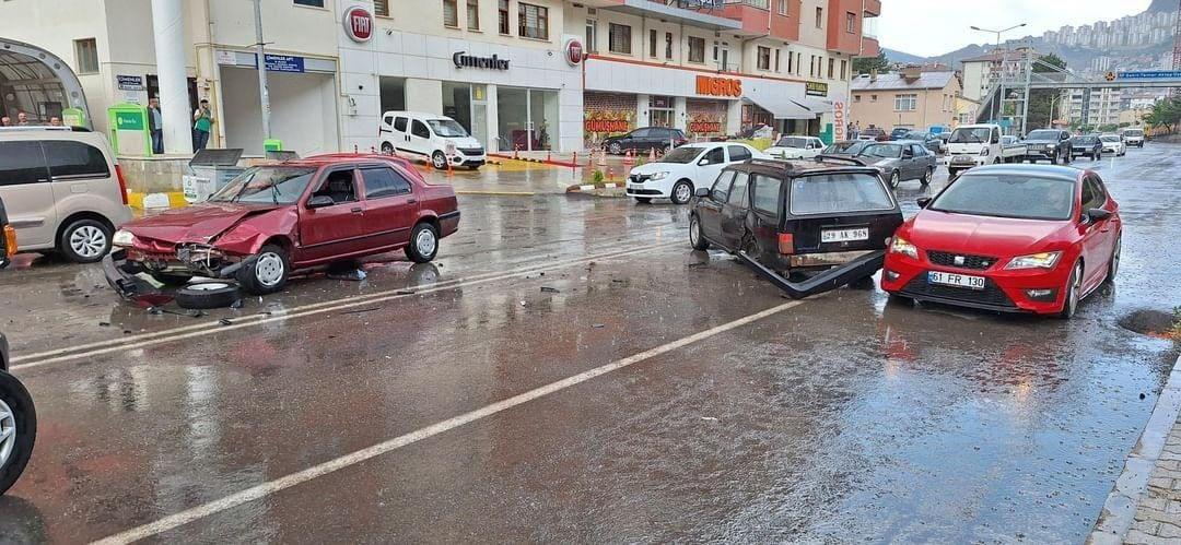 Gümüşhane'de yağmur nedeniyle kayganlaşan yolda 3 aracın karıştığı trafik kazası, maddi hasarla atlatıldı.