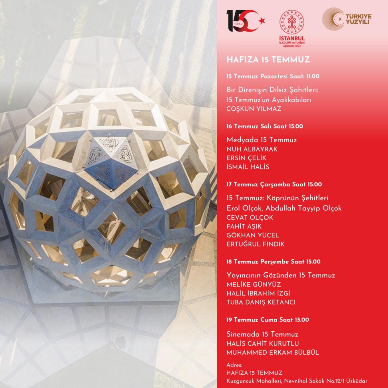 İstanbul İl Kültür ve Turizm Müdürü Coşkun Yılmaz, sosyal medya hesabı üzerinden darbe girişiminin üzerinden 8 yıl geçmesine ilişkin özel programlar düzenleneceğini duyurdu. Programda, ihanet ve işgal girişimi konuşulacak; Türk milletinin şanlı direnişi ele alınacak.