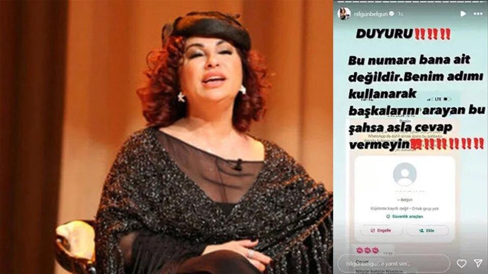 Nilgün Belgün kendisine ait olmayan bir numaradan arkadaşına gönderilen “Canım Nilgün Belgün ben, nasılsın?’ şeklindeki mesajın ekran görüntüsünü Instagram hesabından paylaştı. Paylaşımında “Duyuru! Bu numara bana ait değildir. Benim adımı kullanarak başkalarını arayan bu şahsa asla cevap vermeyin’ ifadelerini kullandı.