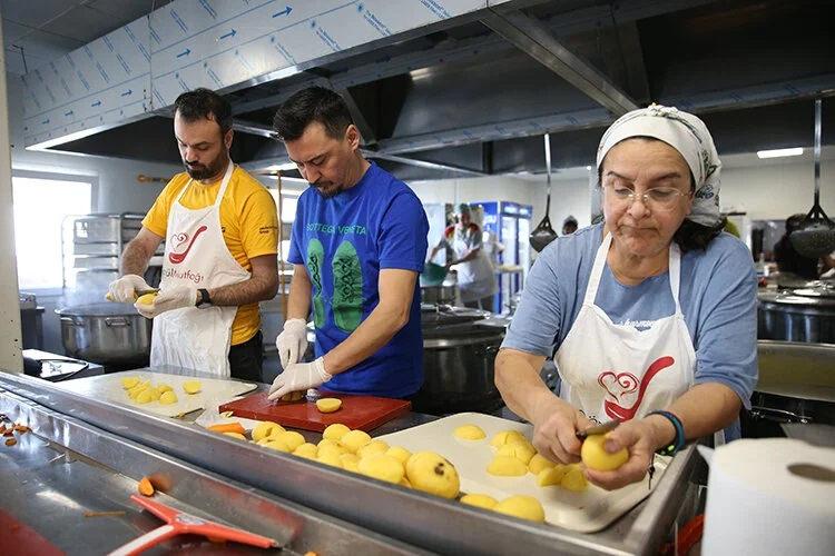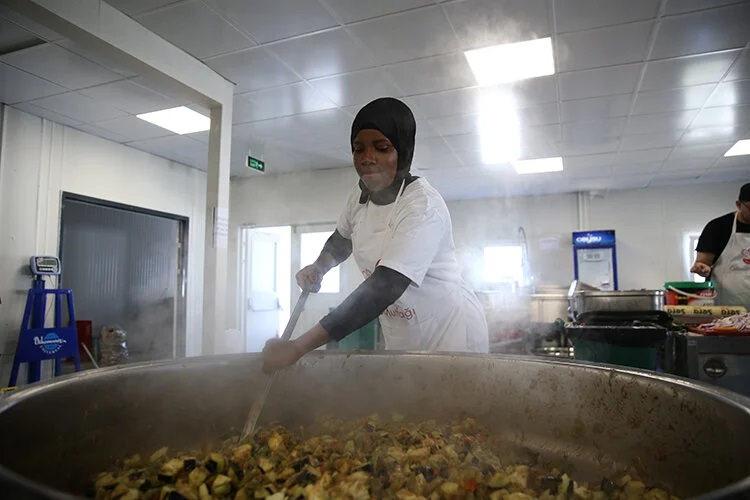 İbrahim Çeçen Konteyner Kenti’ndeki mutfakta, 70 gönüllü iftar sofraları için her gün üç çeşit yemek yapıyor.