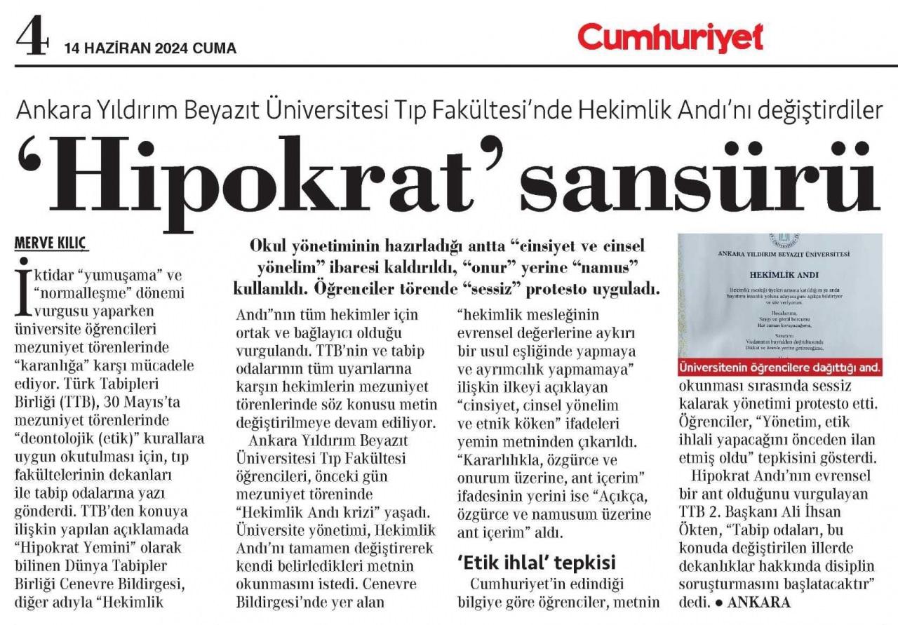 Cumhuriyet gazetesi ise “Ankara Yıldırım Beyazıt Üniversitesi Tıp Fakültesi’nde Hekimlik Andı’nı değiştirdiler – Hipokrat sansürü” başlıklı haberinde, 2 bin 500 yıllık yemine sızdırılan LGBT kavramının genç hekimlere dayatılmamasını eleştirdi.