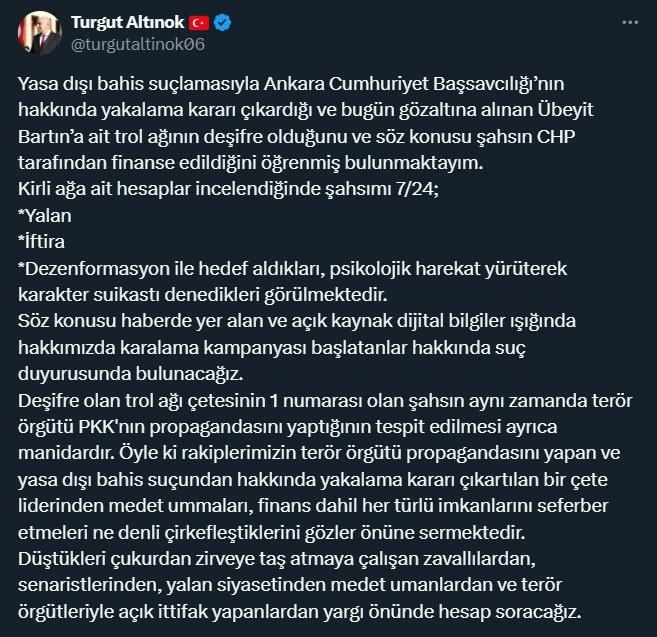 Altınok, trol ağı ile kendisi hakkında karalama kampanyası yapanlar hakkında da suç duyurusunda bulunacaklarını açıkladı.