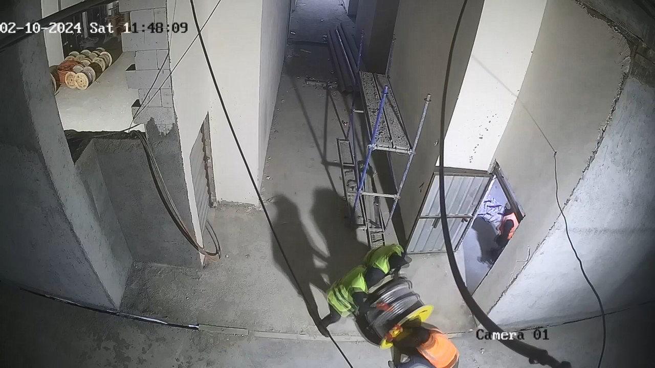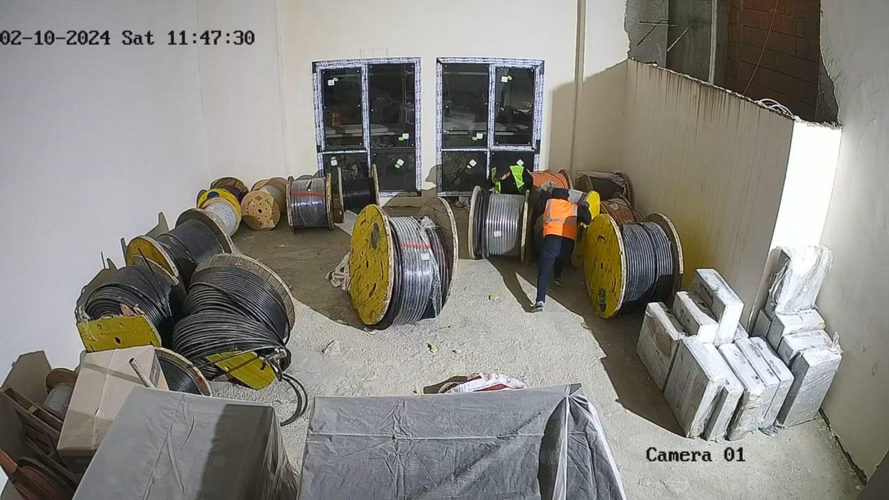 Görüntülerde işçi gibi görünmek için, sarı yelek giydikleri görülen şüphelilerin kablo makaralarını yuvarlayarak inşaattan dışarı çıkardığı görülüyor.