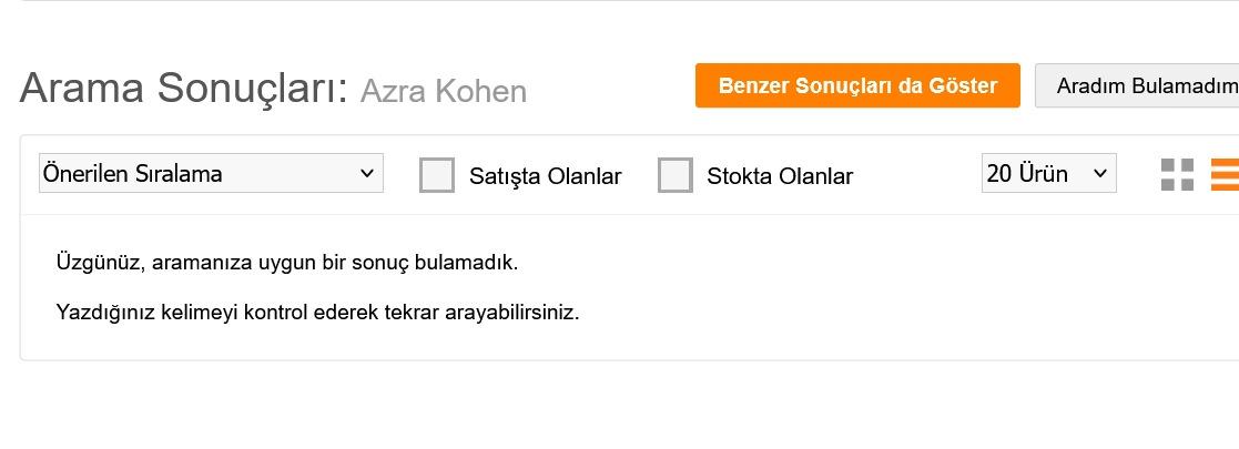 Kitapyurdu’nda Azra Kohen kitabını aratan kullanıcılar, “Üzgünüz, aramanıza uygun bir sonuç bulamadık.” uyarısıyla karşılaşıyor.