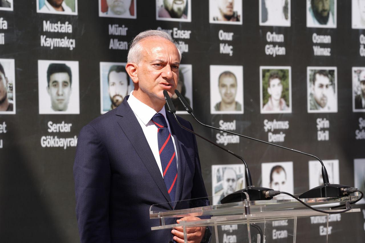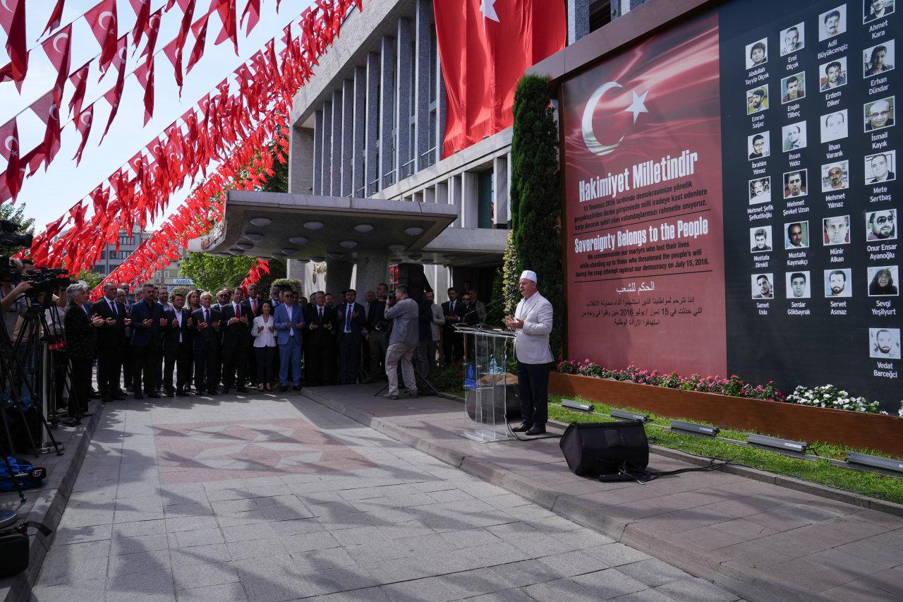 İBB Başkanı Ekrem İmamoğlu, burada yaptığı konuşmada, 15 Temmuz’un ülkenin en kara günlerinden biri olduğunu ve bu acı günde belki de en kanlı noktalarından birisinin İstanbul Büyükşehir Belediyesi önü olduğunu söyledi.