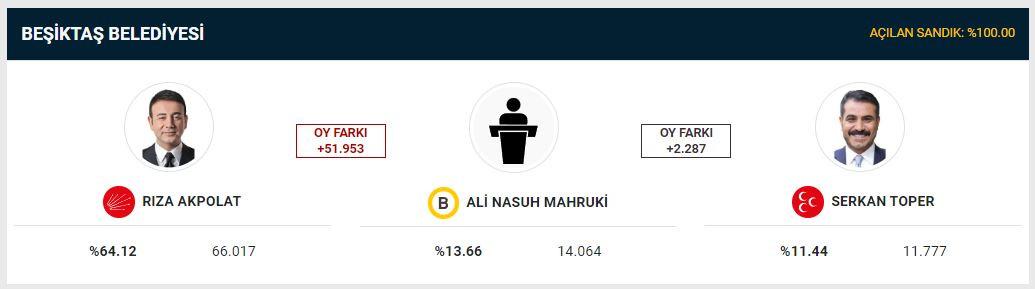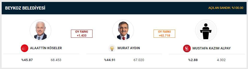 AK Parti’den CHP’ye geçen bir diğer ilçe olan Beykoz’da ise AK Parti ve Yeniden Refah Partisi’nin oyları birleştiğinde CHP’yi 2 puan geride bırakıyordu.