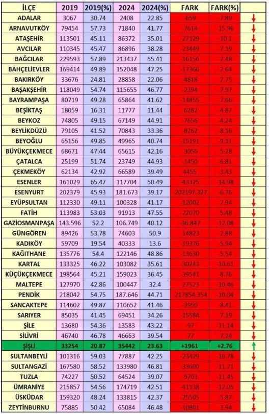 AK Parti’nin İstanbul’da yaşadığı oy kaybı ise şöyle oldu: