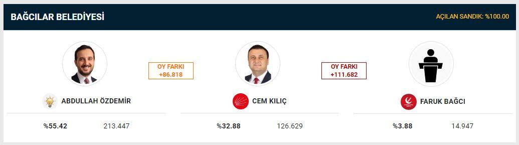 Örneğin Bağcılar’da Murat Kurum 189 bin 378 oy alırken, AK Parti Bağcılar Belediye Başkan Adayı olan Abdullah Özdemir 213 bin 447 oy aldı. Bu da Bağcılar’da 24 bin 69 AK Parti’linin Murat Kurum’a oy vermediğini gösteriyor.