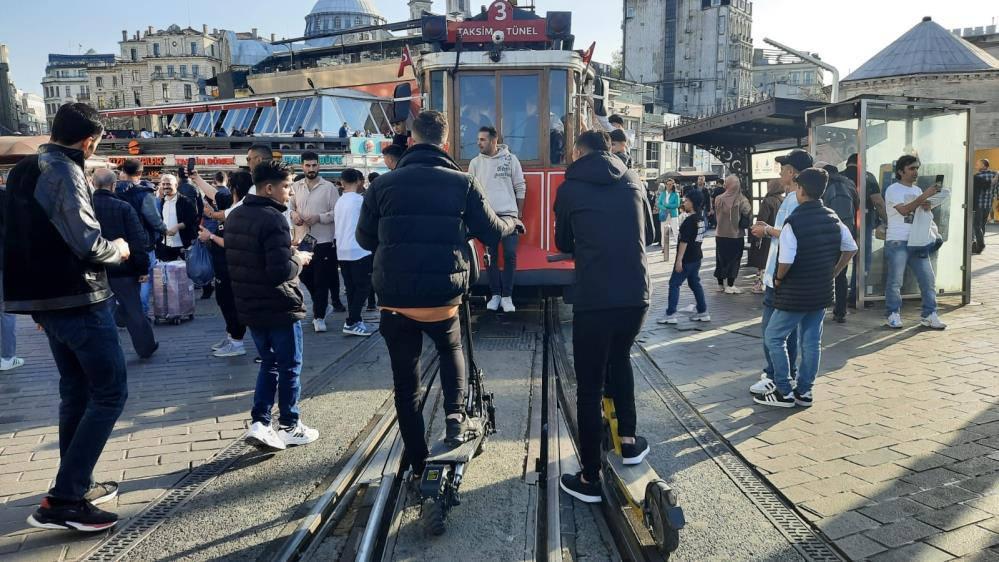 İstiklal Caddesi üzerinde ziyaretçileri taşıyan ve yoğun ilgi gören nostaljik tramvay seferleri yaşanan yoğunluk ve yayaların güvenliği nedeniyle geçici süreliğine iptal edildi.