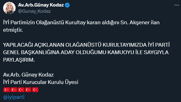 Başarısız sonuçlarla ilgili tartışmalar sürerken İYİ Parti’de ilk aday belli oldu. İYİ Parti Kurucular Kurulu Üyesi Günay Kodaz, sosyal medyadan genel başkanlık için aday olduğunu açıkladı.