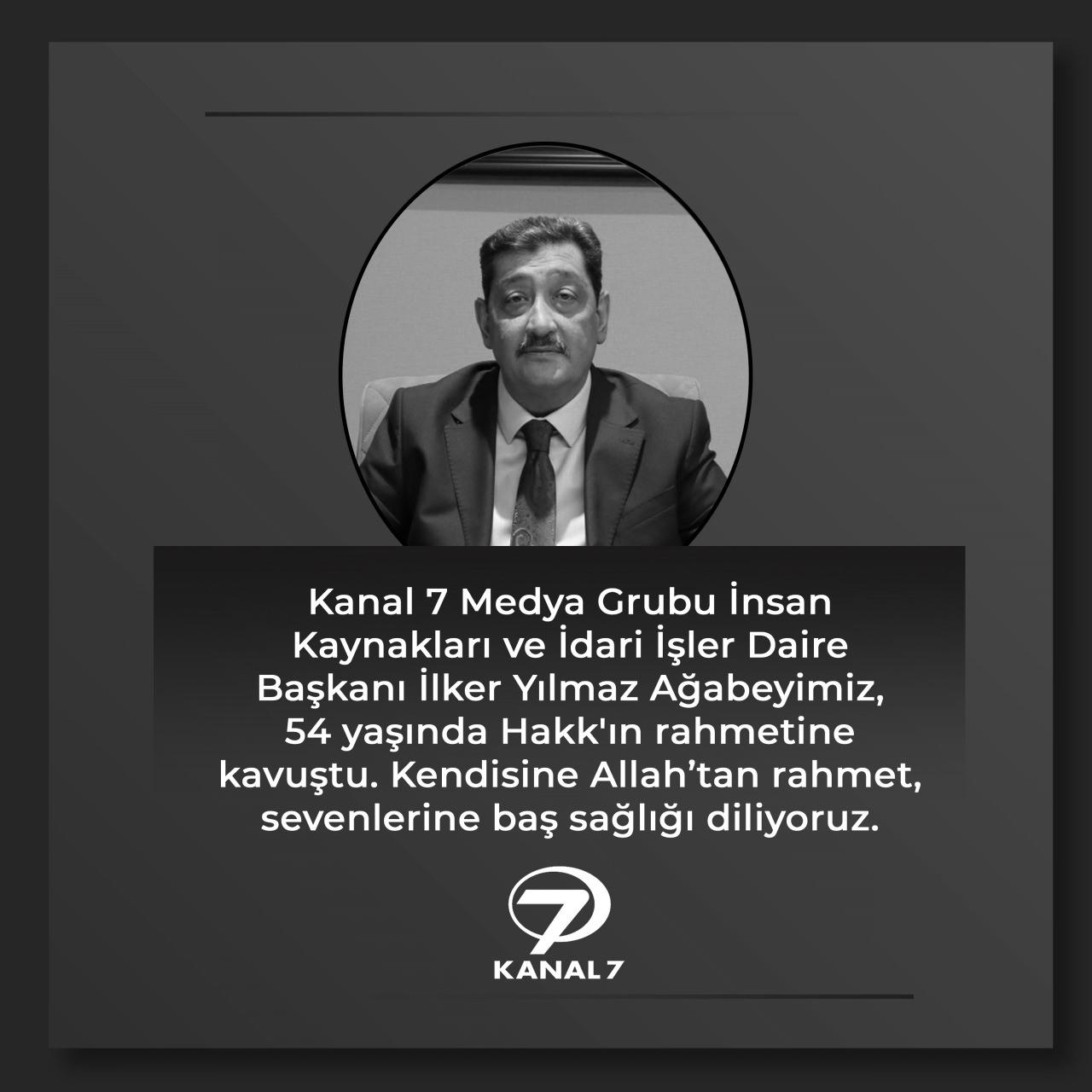 Bir süredir hastanede tedavi gören Kanal 7 Medya Grubu İnsan Kaynakları ve İdari İşler Daire Başkanı İlker Yılmaz Ağabeyimiz, bugün sabah saatlerinde geçirdiği kalp krizi sonucu vefat etti.