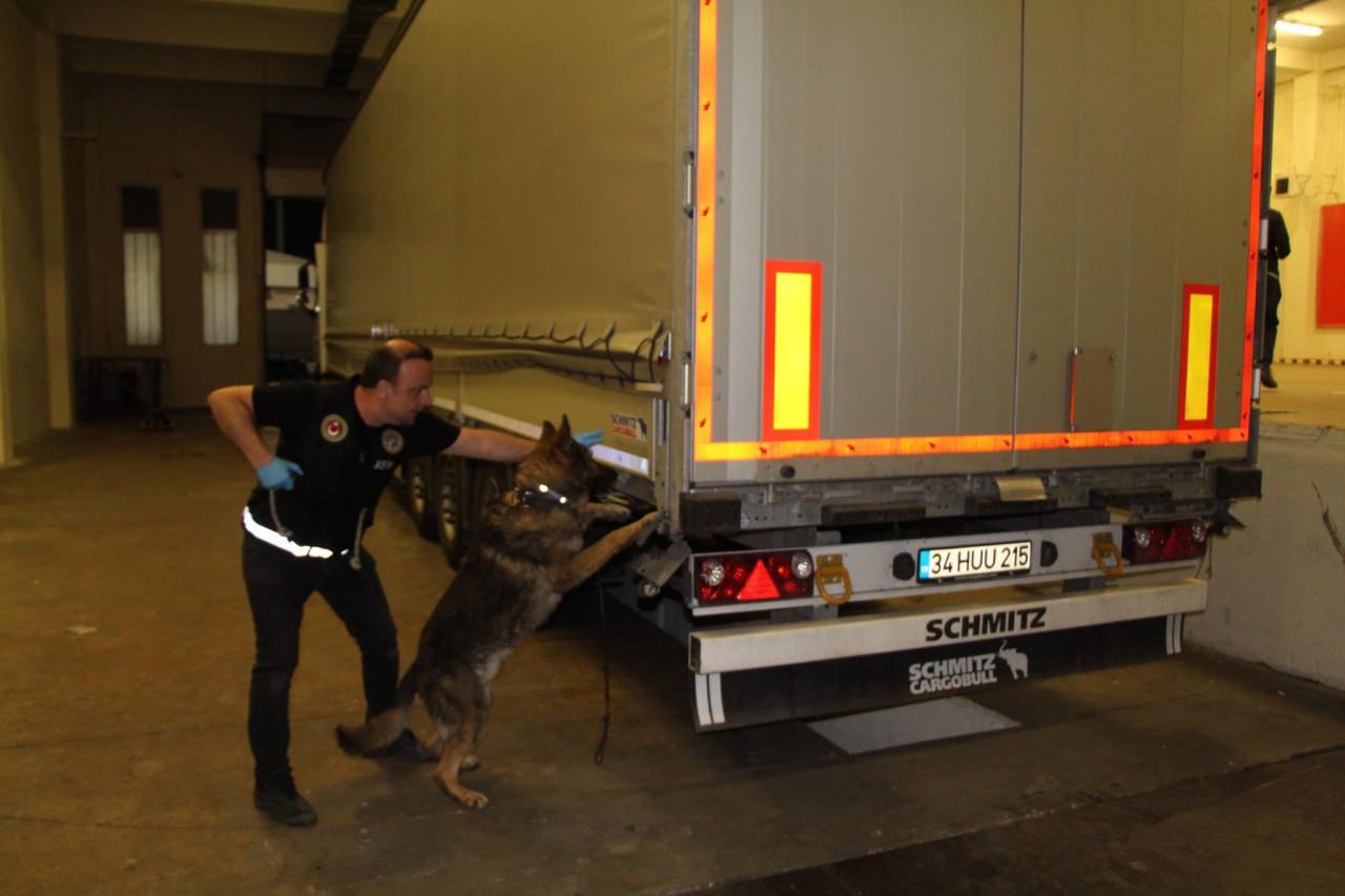 Şüpheli yoğunluk tespit edilen tır dedektör köpek “Füge”nin katıldığı çalışmayla arandı.